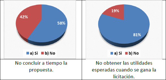 Los dos principales riesgos que las empresas identificaron que corren una vez que han decidido invertir recursos en participar en una licitación fueron: no concluir la propuesta en el plazo establecido; y habiendo logrado la asignación del proyecto no obtener las utilidades presupuestadas (ver Figura 2). Para el caso de no concluir a tiempo, las principales causas que mencionaron fueron las siguientes: personal insuficiente en la empresa, complejidad en los requisitos solicitados por la dependencia y mucha carga de trabajo del personal de la empresa, en los proyectos en ejecución. Para el caso de no obtener las utilidades, las principales causas fueron: errores en la elaboración de la propuesta, pagar los recursos a mayores costos que los considerados y condiciones en la ejecución que no fueron previstas en la elaboración de la propuesta.