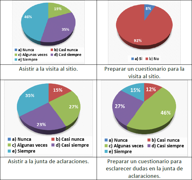 De acuerdo con las respuestas, las empresas usualmente sí asisten a las visitas de obra, y envían a una persona capacitada a este evento con el fin de recopilar información de utilidad sobre del sitio de los trabajos y con la cual, posteriormente hacen un análisis. Esto es una buena práctica en las empresas; sin embargo, el diagnóstico dio a conocer que la información que se recopila suele ser incompleta o muy variada entre las empresas, hecho que se reafirmó al saber que muy pocas empresas cuentan con una lista de verificación de los puntos importantes del sitio de la obra para la visita; de lo anterior se infiere que la información que recopilan probablemente no sea completa y/o precisa. Santos (2004) da soporte a esta afirmación ya que comenta que entre las empresas se carece de una planeación e interés para analizar la información que se debe y puede obtener durante la visita al sitio del proyecto u obra.
