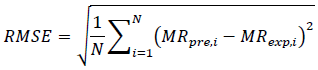 (4)Donde 𝑀𝑅𝑒𝑥𝑝,𝑖 denota la relación de humedad experimental, 𝑀𝑅𝑝𝑟𝑒,𝑖 es la relación de humedad predicha por el modelo matemático, N es el número de observaciones, y 𝑛 es el número de constantes.