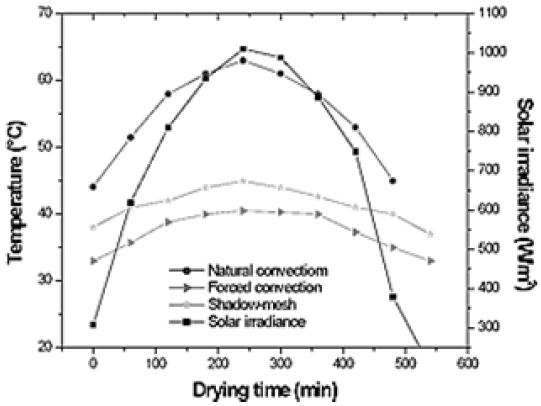 LaFigura 4 Irradiancia solar, temperatura ambiente y humedad relativa durante el periodo de pruebas muestra el cambio en la irradiación solar recibida de aproximadamente 1000 W/m2. También se midieron las variaciones de temperatura dentro de las cámaras de secado. Con el secado por convección natural, la temperatura interna osciló generalmente entre 40 y 50 °C, con un valor máximo de 60 °C. En el caso del secado por convección forzada, la temperatura interna generalmente osciló entre 30 y 35 °C, con un valor máximo de 40 °C. Cuando la cámara de secado se cubrió con malla sombreada, las temperaturas medias oscilaron entre 35 y 40 °C, con un valor máximo de 43 °C.
