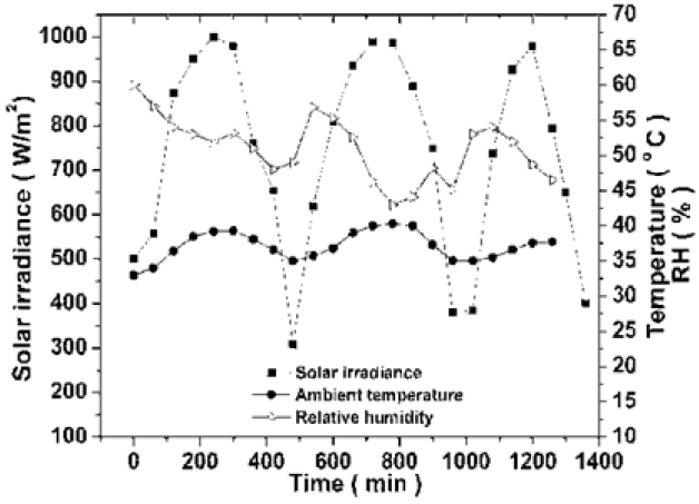 Como se puede ver, una irradiación global solar máxima de 1000 W/m. se alcanzó, con los valores máximos medios que oscilaban entre 950 y 980 W/m.. La temperatura ambiente mínima promedio fue de 33 °C, mientras que la temperatura ambiente máxima promedio fue de 40 °C. Por otro lado, el RH mínimo osciló entre 52 y 55%, mientras que el RH máximo osciló entre 32.65 y 50%. Secado Solar Directo (Gabinete).