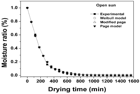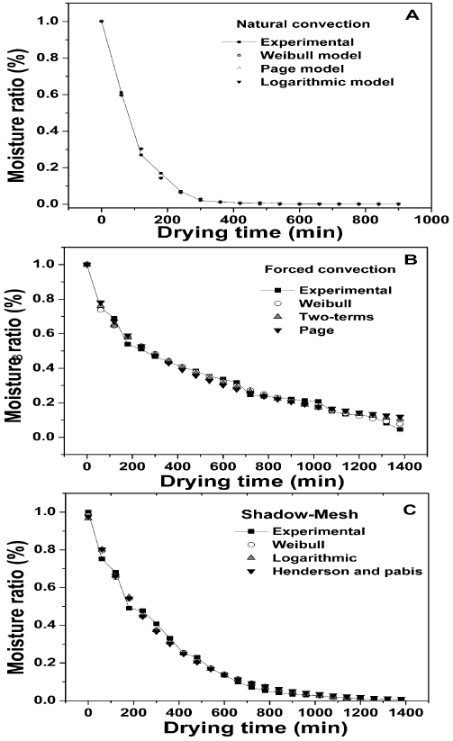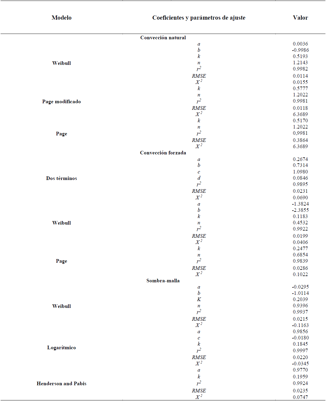 El mejor ajuste para el DSD con la convección natural se logró mediante Weibull, Page y modelos de Page modificados, con R2 de 0,9982, 0, 9981 y 0, 9981; y un X2 de 0,0155, 6,3689 y 0,0406 respectivamente. Mientras tanto, los mejores resultados con la convección forzada fueron obtenidos por los Dos-término, Weibull, y los modelos de la Page, con R2 de 0,9895, 0,9922 y 0,9839; Y X2 de 0,0690, 0,0406, y 0,1022, respectivamente. El mejor ajuste para DSD con malla de sombra fue obtenido por Weibull, logarítmico y Henderson, y modelos Pabis, con R2 de 0,9937, 0,9997 y 0,9924; y un X2, de 0,1163,-0,0345, y 0,0747, respectivamente.