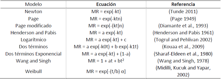 Para analizar el comportamiento de secado de diferentes productos agrícolas, se han propuesto previamente modelos matemáticos para describir su cinética de secado por difusional. Los modelos más ampliamente utilizados se enumeran en la Tabla 1. Se puede observar que la relación de humedad (MR) se considera como una función del tiempo de secado, que se puede calcular como: