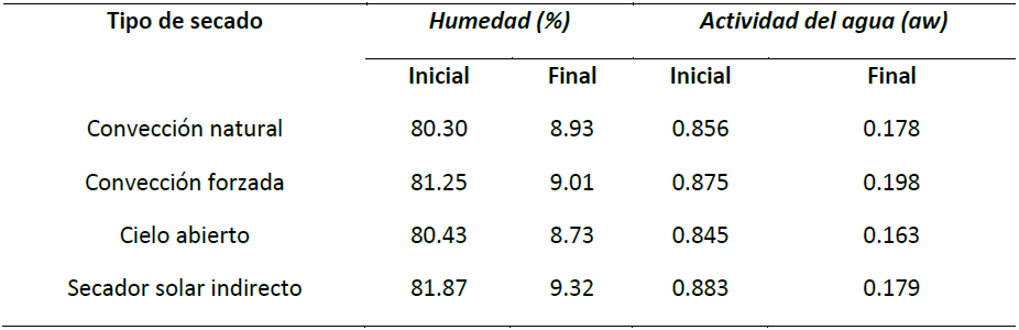 Los valores iniciales y finales de humedad y actividad de agua de las hojas frescas y secas se enumeran en la Error! Reference source not found. para cada modo de convección, incluyendo el sol abierto y el secador solar indirecto.