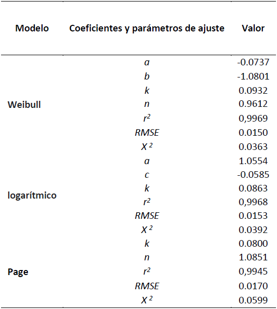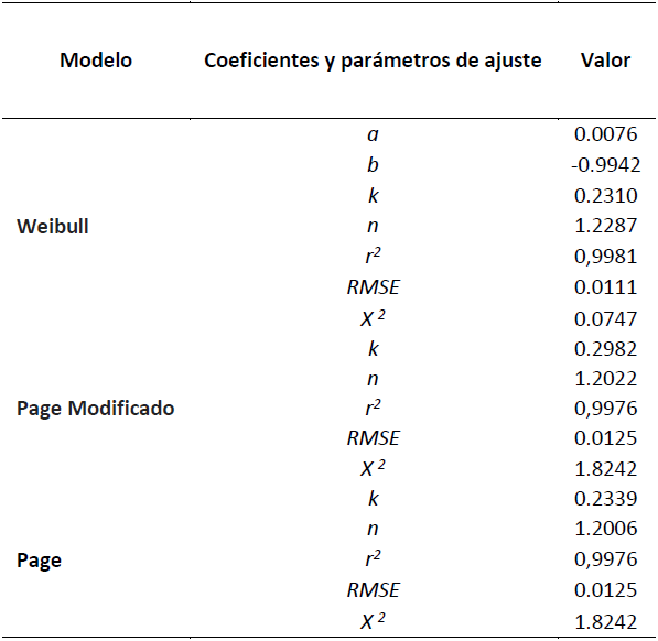 El coeficiente de determinación (R2) se utilizó en este estudio como uno de los criterios primarios para seleccionar el modelo más preciso en comparación con los datos experimentales (Midilli, Kucuk and Yapar, 2002). R2 se evaluó calculando los diferentes parámetros involucrados en los modelos de ajuste seleccionados utilizando la versión de software DataFix 9,1. Además, la ji-cuadrado reducida (χ2) y el error raíz-medio-cuadrado (RMSE) fueron utilizados como criterios aptos para los datos. El RMSE proporcionó la desviación entre los valores experimentales y predichos, con menos desviación indicada por valores más cercanos a cero. El modelo con el coeficiente de determinación más alto y el RMSE más bajo fue seleccionado como el mejor modelo para describir la cinética de sequía de las hojas del orégano. Se puede lograr un mejor ajuste si el valor de (χ2) se reduce según la literatura (Sarracino M. et al., 2018).
