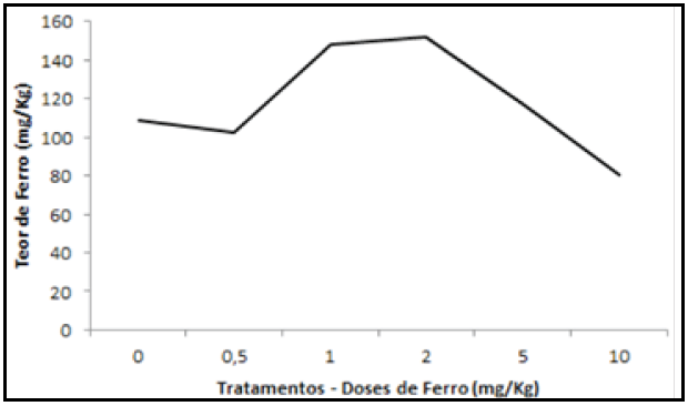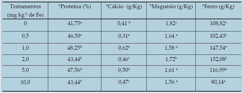 Nas Figuras 1, 2 e 3 os gráficos apresentam as variações entre dosagens e tratamentos utilizados. Pelos resultados, tem-se que os tratamentos com 1 e 5 mg Kg−1de Fe não diferiram estatisticamente entre si apresentando o maior percentual de proteína.