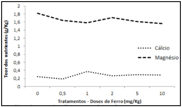 O teor de ferro variou significativamente entre todos os tratamentos, sendo que, o tratamento 10 mg Kg−1 apresentou o menor valor de ferro absorvido. Aliado a isto, o tratamento de 2 mg Kg−1 apresentou o maior teor de absorção pelo basidioma. Na Tabela 1, pode-se observar que há incremento no acúmulo de ferro nos cogumelos à medida que aumenta a concentração deste nutriente no substrato. Entretanto, ao atingir o valor máximo de absorção de ferro, no tratamento de 2 mg Kg−1, ocorre queda na absorção, enquanto que, no tratamento 10 mg Kg−1, o teor torna-se inferior ao apresentado pelo controle. COLAUTO (2010), testando doses crescentes de ferro no substrato para crescimento de P. ostreatus, observou que em doses elevadas de Fe o crescimento do fungo foi inibido. O teor de cálcio no tratamento com 1 mg Kg−1 de ferro aumentou em 66,12% quando comparado ao tratamento controle. O teor de magnésio foi maior no tratamento controle, seguido pelo tratamento 2 mg Kg−1 e os demais tratamentos não diferiram entre si estatisticamente (Tabela 2).