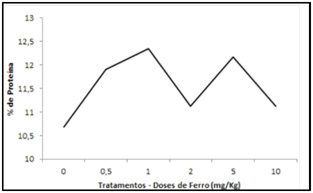 A percentagem de proteína aumentou com o aumento das doses de Fe adicionadas ao substrato, em comparação com o tratamento controle (Figuras 2 e 3). Entretanto para a dose de 2 mg Kg−1 de Fe este aumento foi menor do que nos demais tratamentos.