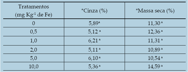 Após 20 dias da inoculação, os substratos contendo os seis tratamentos com diferentes concentrações de ferro estavam plenamente colonizados pelo micélio fúngico e a primeira colheita ocorreu após cinco dias desta colonização. A farinha obtida foi dessecada em mufla para determinação de massa seca e cinzas, conforme a Tabela 1. As doses de Fe testadas não afetaram significativamente a produção de cogumelos, pois valores destes parâmetros não variaram significativamente.
