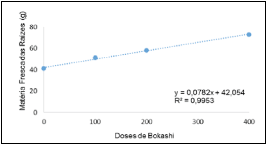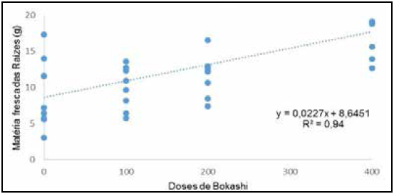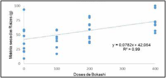 Para os valores de massa de matéria seca das raízes e doses de bokashi (figura 5), os resultados apresentam uma correlação positiva forte superior a 94%.