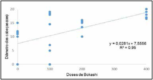 Para o efeito das doses de bokashi em relação ao diâmetro das cabeças (figura 12), observa-se no ajuste dos dados a uma regressão linear crescente, apresentando um coeficiente de determinação de 95%.