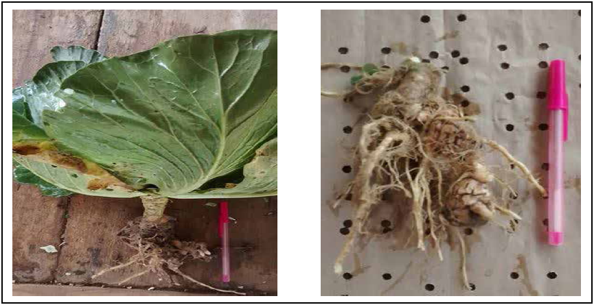 A hérnia das crucíferas, causada por Plasmodiophora brassicae W., é um dos principais problemas nas áreas produtoras de Brassica em todo o mundo (VIDAL, 2012). De acordo com PEREIRA (2013), os principais sintomas da hérnia das crucíferas na parte aérea são deficiências nutricionais e desenvolvimento retardado. As plantas atacadas murcham nas horas mais quentes do dia e retomam a turgidez nas horas mais frescas. Em algumas situações, as folhas ficam com uma coloração verde mais pálido ou amarelecem. O sintoma característico (Figura 1) é a formação de galhas nas raízes, provenientes da rápida multiplicação e crescimento exagerado das células induzidas pelo patógeno. Segundo REIS (2009), as galhas variam de tamanho podendo medir desde alguns milímetros até mais de 10 cm de comprimento.