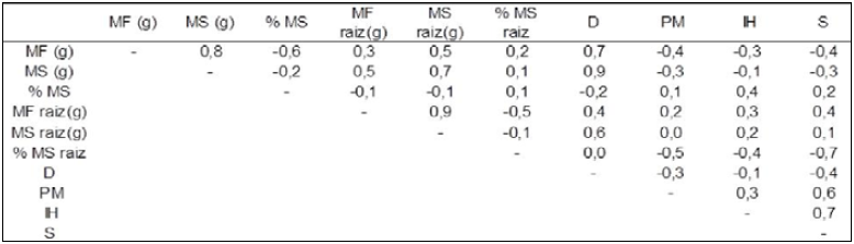 De acordo com os resultados apresentados na figura 2, pode-se destacar que existe uma forte correlação positiva (0,9) entre as variáveis matéria seca (MS) e diâmetro (D), o que indica que com o aumento do acúmulo de matéria seca há um aumento do diâmetro das cabeças de repolho. Entre as variáveis % matéria seca das raízes (%MS raiz) e severidade (S) houve uma correlação negativa forte (-0,7), indicando que quanto mais grave o nível de severidade menor o acúmulo de matéria seca nas raízes. As variáveis Incidência de hérnia (IH) e severidade (S) apresentaram correlação positiva forte com valor de 0,7, o que leva a acreditar que com o aumento da incidência há um proporcional aumento da severidade da doença hérnia das crucíferas.