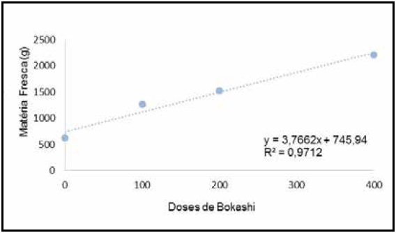 Pode-se observar um aumento significativo da produtividade com o aumento da dosagem de bokashi. JÚNIOR e VENZON (2007) ressaltam que as hortaliças pertencem ao grupo de culturas que apresentam respostas positivas, tanto em produtividade como em qualidade de produto, quando submetidas à adubação orgânica.