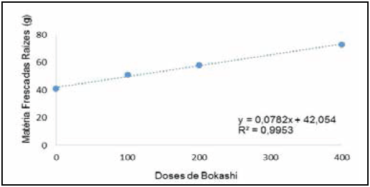 A correlação entre os valores de massa de matéria seca e doses de bokashi (figura 3), apresentou grau de associação de 99% o que indica correlação positiva forte, ou seja, com o aumento da dosagem do bokashi há um incremento no teor de massa seca. Entre os valores de massa de matéria fresca das raízes e doses de bokashi (figura 4), os resultados apresentam uma correlação positiva forte superior a 99%.