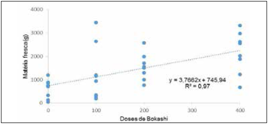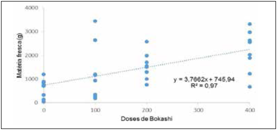 De acordo com a análise de regressão linear simples, observou-se um efeito significativo positivo para a dosagem de bokashi. As variáveis em estudo apresentam coeficiente de determinação (R2), próximos a 1. O R2 varia entre 0 e 1, indicando, em percentagem, o quanto o modelo consegue explicar os valores observados. Para matéria fresca 97% da variável dependente consegue ser explicada pelos repressores presentes no modelo (figura 8).
