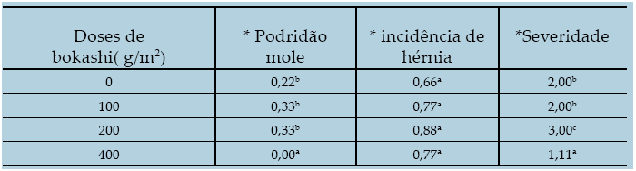 A dosagem 400 g/m2 foi o tratamento que apresentou a menor incidência da hérnia das crucíferas e a menor severidade. Durante o experimento, foi constatada a incidência de podridão-mole (Pectobacterium carotovorum) na área podendo, portanto, ser considerada uma fonte de infestação e que também foi combatida pelo bokashi.
