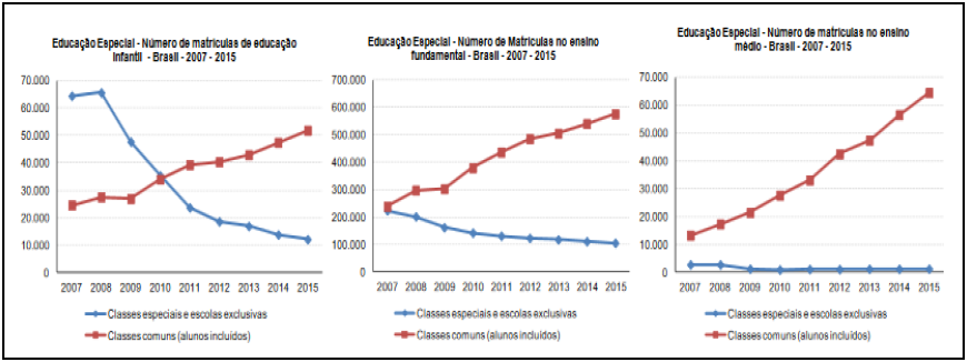Todas essas leis dão amparo e suporte a matricula compulsória do aluno com deficiência em escolas da rede regular de ensino, e a partir dessas políticas públicas, o número de matrículas de alunos com necessidades especiais em turmas regulares vem crescendo nos últimos anos. Esse crescimento pode ser observado, na Figura 1 abaixo, com dados do Censo de 2015, realizado pelo Ministério da Educação (BRASIL, 2016):