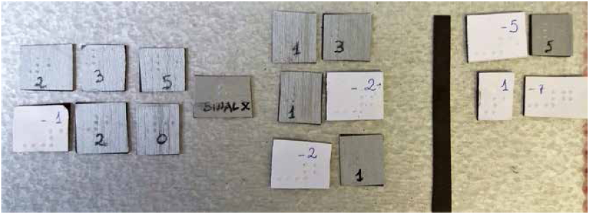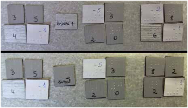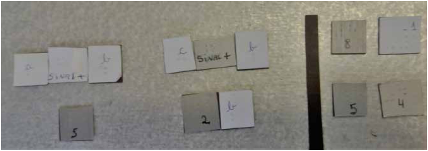 Primeiramente, datilografamos números positivos e negativos, (letras, sinais e demais itens) que vamos utilizar no papel ou adesivo para Braille. Em seguida, fixamos este material nos imãs de geladeira e recortamos de maneira adequada e cuidadosa, uma vez que o manuseio acontece sobre a placa de metal (ver Figura 2).