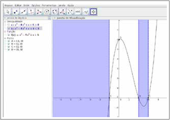 Os alunos receberam um material impresso contendo a atividade, digitaram a função polinomial no campo Entrada do software GeoGebra, analisaram o gráfico construído e formularam, individualmente, suas conclusões. A atividade desenvolvida foi preparada seguindo um caráter sistemático, ou seja, as respostas a cada item da atividade são gradativas, permitindo ao aluno observar, analisar e registrar suas observações, a fim de construir e fixar os conceitos sobre o conteúdo. Ao final da atividade, os discentes entregaram ao professor os resultados obtidos a partir de suas observações.