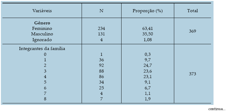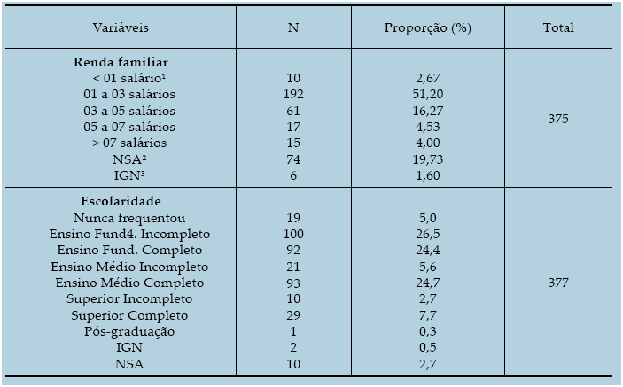 Para conhecimento e categorização da população entrevistada foi realizado um questionário, onde os resultados são mostrados na Tabela 1. A maioria dos entrevistados pertencia ao gênero feminino (63,41%). Com relação aos integrantes da família, o mais frequente foi um núcleo familiar com duas pessoas (24,7%), no entanto, núcleos com três (23,6%) e quatro pessoas (23,1%) também foram bastante encontrados. A maioria (51,20%) dos entrevistados possuía renda familiar entre um e três salários. E por fim, com relação ao nível escolar, o Ensino Fundamental Incompleto (26,5%) foi o mais relatado.