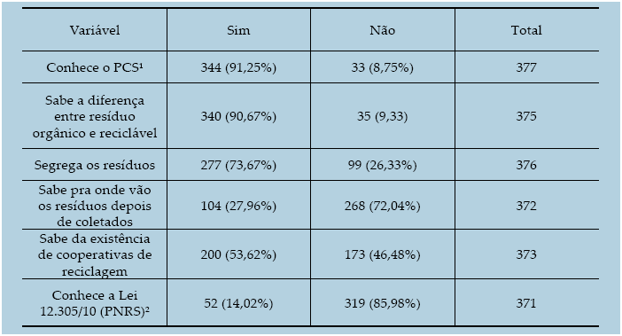 Dados referentes ao entendimento sobre o PCS implantado no município; sobre o conhecimento, legislação e gerenciamento de resíduos sólidos; e sobre a existência de cooperativas de reciclagem podem ser observados na Tabela 2. A maioria (91,25%) dos entrevistados relatou conhecer o PCS, 90,67% afirmaram saber a diferença entre resíduos orgânicos e recicláveis, e 73,67% disseram segregar os resíduos em suas residências. No entanto, 72,04% dos entrevistados afirmaram não saber para onde vão os resíduos recicláveis depois de coletados, a maioria (53,62%) também afirmou desconhecer a existência das cooperativas de reciclagem e 85,98% relataram não conhecer a lei 12.305 que trata da PNRS.