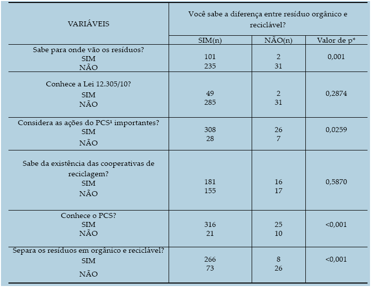 Com relação ao cruzamento da variável “Sabe a diferença entre resíduo orgânico e reciclável”, pode-se visualizar na Tabela 3 que 63,68% (235/369) dos entrevistados conhecem essa diferença, porém desconhecem o destino destes resíduos após a coleta (p= 0,001), 83,50% (308/369) da população que sabe a diferenciação entre os resíduos, também afirmaram considerar importantes as ações do PCS (p=0,0259), com relação ao conhecimento do PCS, 84,95% (316/372) declararam saber a diferença entre os resíduos e conhecer o PCS (p<0,001), e por fim, a maioria que sabe a diferença entre os resíduos (71,31% - 266/373) também realiza a segregação dos mesmos em suas residências. Para aqueles que sabem segregar seus resíduos e não o fazem (19,57% - 73/373), foi alegado falta de tempo como justificativa. Todas estas correlações foram significativamente estatísticas.