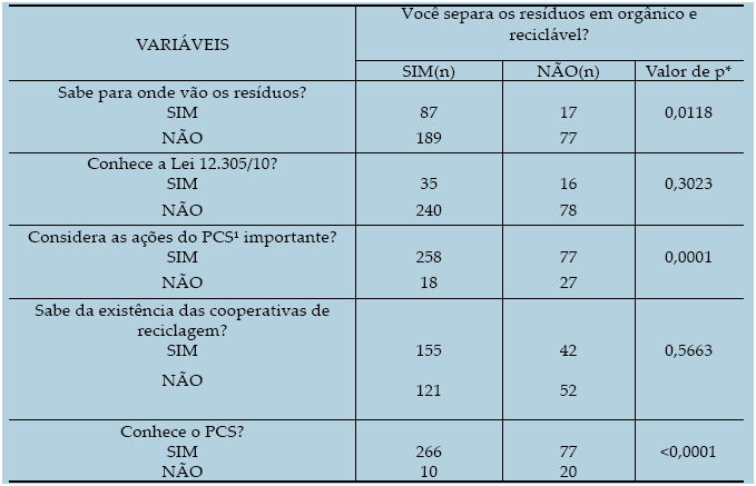 Com relação ao cruzamento da variável “Você separa os resíduos em orgânico e reciclável”, mostrado na Tabela 4, pode-se observar que os dados estatisticamente significativos compreendem aqueles entrevistados que separam os resíduos (51,08% - 189/370), apesar de não saberem para onde estes vão após a coleta em suas residências (p=0,0118); visualiza-se também que a maioria das pessoas que possuem o conhecimento de separar os resíduos (67,89% - 258/380), também consideram as ações do PCS importantes (p=0,0001); e por fim, a maioria dos entrevistados que separa os resíduos em orgânico e reciclável (71,31% - 266/373), também conhece o PCS do município (p<0,0001).