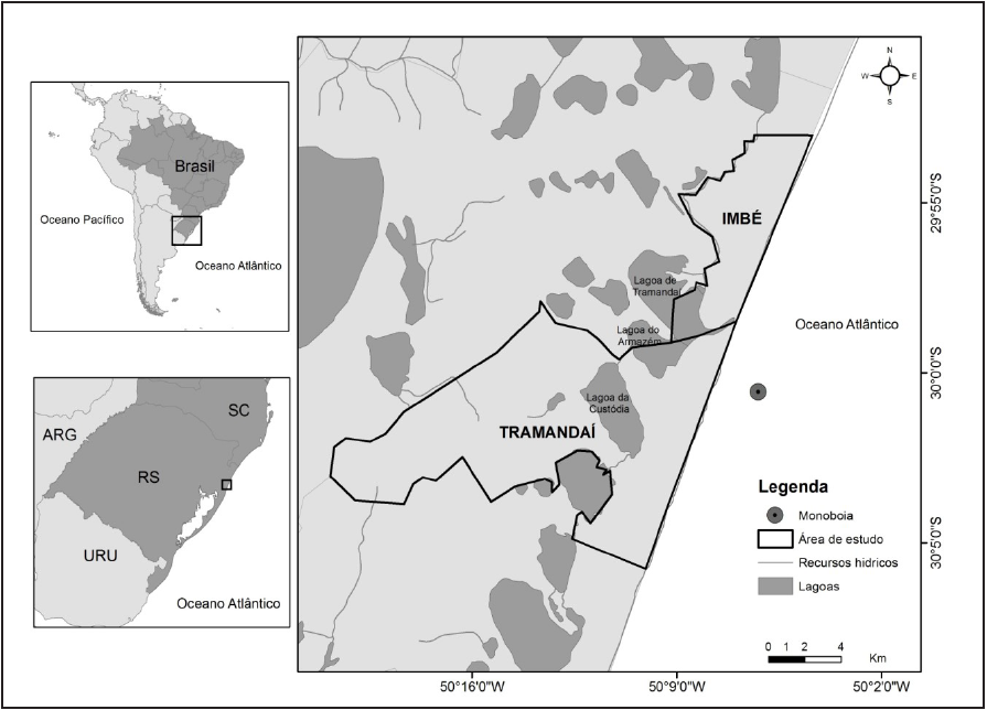 A área de estudo (figura 1), compreende dois municípios costeiros, vizinhos, situados no litoral Norte do Estado do Rio Grande do Sul, com uma distância de 118 km da Capital Porto Alegre. Tramandaí apresenta segundo o Censo do IBGE (2010), uma população de 41.585 habitantes e uma área de 144,408 km², com localização geográfica de Latitude: 30º 00’ 38’’ Sul e Longitude: 50º 09’ 08’’ Oeste, e Imbé, com 17.670 habitantes, ocupando 39,395 km² de extensão territorial apresentando as coordenadas de Latitude: 29º 58’ 31’’ Sul e Longitude 50º 07’41’’ Oeste.