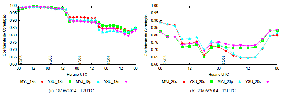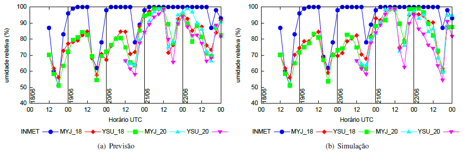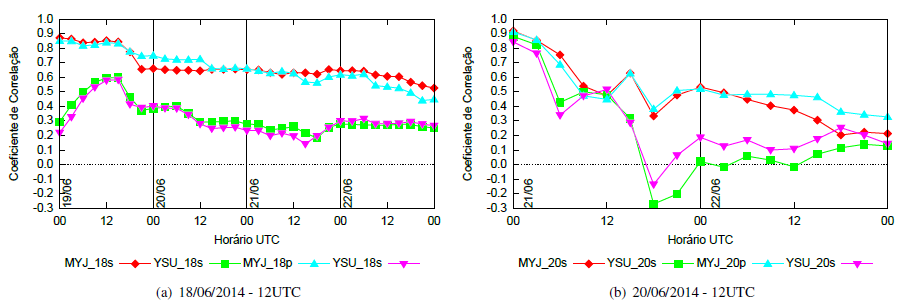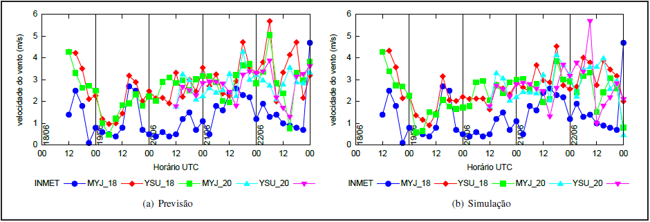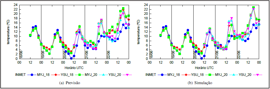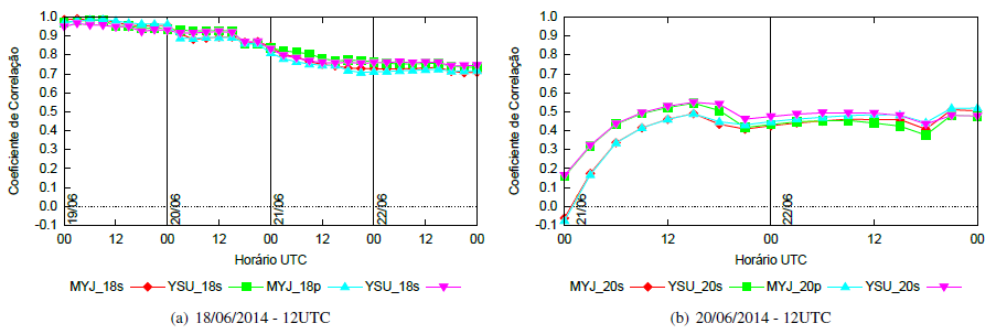 A correlação entre as temperaturas a 2m geradas pelo WRF com os dados observados, figura 10 mostram um bom comporta- mento do modelo, principalmente para a rodada do dia 18/06 (figura 10(a)). Nesta rodada, começam a surgir diferenças mais expressivas entre as parametrizações no terceiro a partir das 12UTC do dia 20/06. Para a rodada do dia 20/06, figura 10(b), o esquema MYJ se mostra mais eficiente, tanto para previsão como para simulação dos eventos. Porém, a correlação é, em geral, mais baixa que para a rodada do dia 18/06.