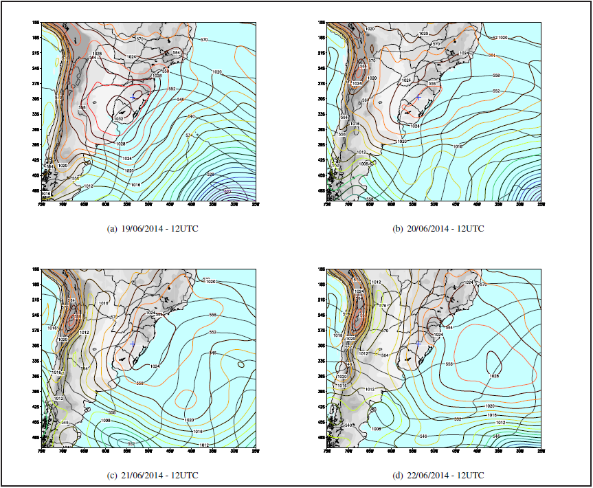 Nota-se a presença de um intenso anticiclone no dia 19/06 (figura 1(a)), com centro a sudoeste da região de interesse que se desloca na direção nordeste, passando pela região de interesse e se enfraquecendo, conforme indicam as figuras 1(b), 1(c) e 1(d).
