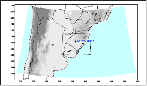 Para o estudo foram utilizadas duas grades aninhadas. A grade externa foi construída com uma resolução horizontal de 12km enquanto a grade interna empregava uma resolução horizontal de 4km. A figura 2 apresenta o domínio de cada uma das grades utilizadas;