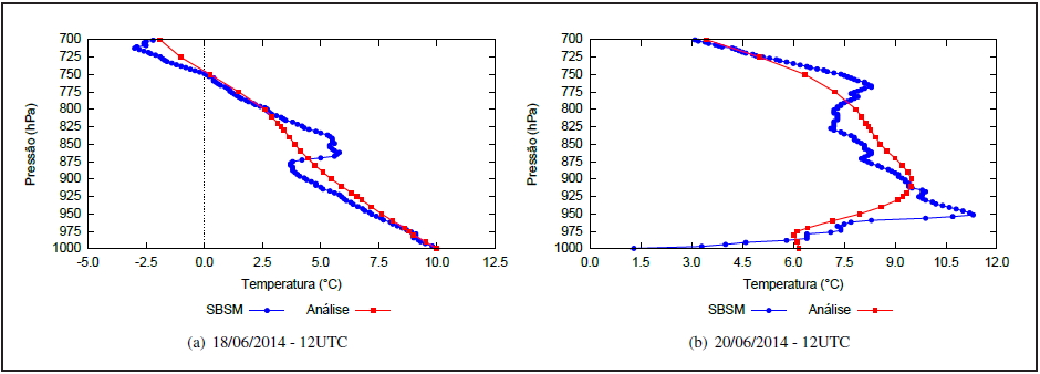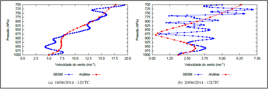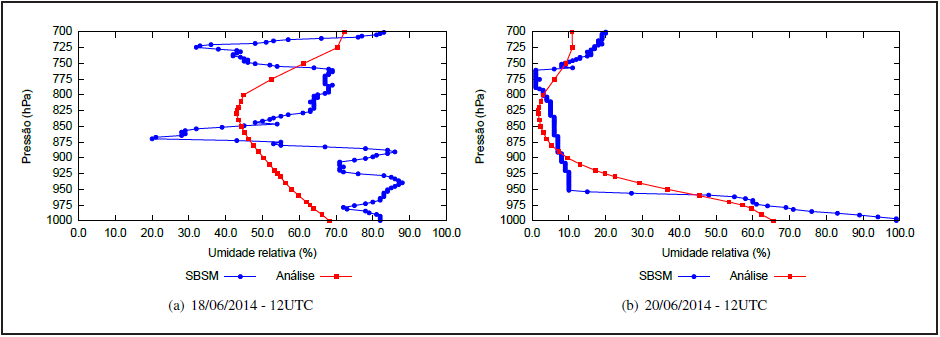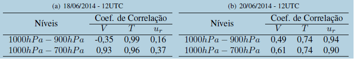 Para avaliar a condição inicial do modelo, no local de interesse do estudo, foram utilizados como comparação os dados de sondagem do Aeródromo de Santa Maria (SBSM), para as 12 UTC dos dias 18 e 20 de junho. As figuras 3, 4 e 5 mostram a comparação entre a condição inicial da baixa troposfera para a magnitude da velocidade do vento, temperatura e umidade relativa, respectivamente. As tabelas 1(a) e 1(b) mostram o coeficiente de correlação entre os dados observados e os utilizados como condição inicial entre os níveis de 1000hPa e 900hPa e 1000hPa e 700hPa.