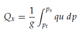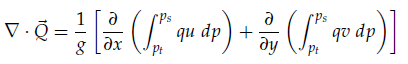 (4)Na equação 4, g representa a aceleração da gravidade, q é a umidade específica, ps representa a pressão atmosférica em 1000 hPa e pté a pressão em 300 hPa. Os produtos qu e qv, representam, respectivamente, os transportes horizontais de umidade pelo vento zonal e meridional.