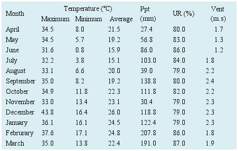In order to evaluate the distribution of the data set, a Shapiro-Wilk test was performed. As the normality assumption could be met, the ANOVA analysis of variance was applied to compare the litterfall among the three study areas, followed by the post hoc Tukey’s test, using the PAST 2.04 program. (p < 0.05) (Hamer et al., 2001). To evaluate the influence of climatic factors on litterfall during the study period, the Pearson’s correlation (p < 0.05) was calculated between monthly litterfall and climatic variables (maximum, mean and minimum temperatures, precipitation, relative humidity and wind speed) (HAMMER et al., 2001). Information on monthly climatic data was obtained at the EPAGRI Experimental Station of Criciúma, Santa Catarina (Table 1).