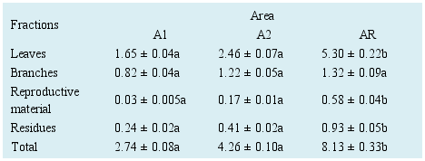 The leaf fraction was dominant in the three areas (Figure 1b), and in A1 the contribution was 60%, in A2 58% and in AR 65%. The second most representative fraction in the three study areas was branches that contributed 30% to A1, followed by A2 (29%) and AR (16%).