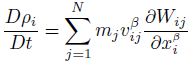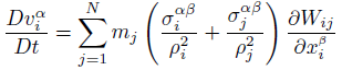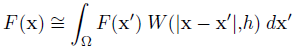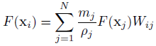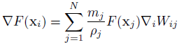 onde a função F(x), na posição xi, é aproximada através da soma ponderada (pela função de suavização W) dos seus valores determinados nas posições correspondentes às N partículas vizinhas, que se encontram dentro do domínio de influência da partícula i. A massa e a massa específica são representadas por mj e ƿj , respectivamente, e Wij = W(|xi − xj |, h) representa a função de suavização.
