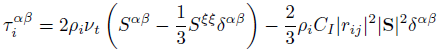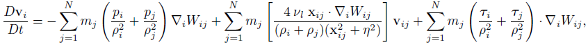 No tratamento do termo viscoso da equação de Navier-Stokes ele é decomposto em duas contribuições: uma devida ao modelo laminar (Lo e Shao, 2002) e outra ao modelo turbulento Sub-Particle Scale (SPS) (Gotoh et al., 2004; Dalrymple e Rogers, 2006; Ricardo et al., 2016). Usando-se uma formulação simétrica na discretização do termo de tensão (Lo e Shao, 2002) obtém-se:
