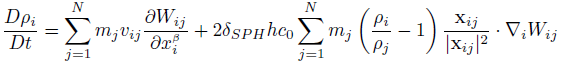 A correção δSPH corresponde à introdução de um termo de difusão artificial para a equação do balanço de massa, adicionado à equação da continuidade, a fim de remover as oscilações espúrias de alta frequência no campo de pressão (Marrone et al., 2011). Esse termo difusivo foi proposto por Molteni e Colagrossi (2009) e a equação da continuidade é reescrita como