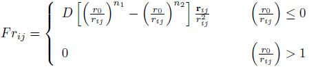 onde n1 e n2 são parâmetros que devem ser fornecidos, geralmente 12 e 4 respectivamente. D é um parâmetro que depende do problema considerado e deve ser escolhido de modo que o seu valor tenha a mesma ordem de grandeza do quadrado da maior velocidade das partículas. A variável r0 representa a distância máxima para que a força de repulsão seja aplicada.