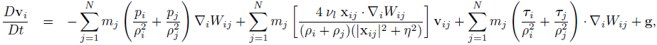 Na formulação SPH, as equações que governam o escoamento de um fluido newtoniano, Eqs. (3)-(4), são discretizadas empregandose a Aproximação por Partículas para os operadores diferenciais (Góes, 2011):