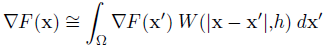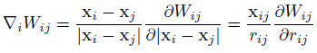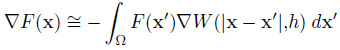 e levando-se em consideração que a função de suavização possui um suporte compacto (Góes, 2011). Assim sendo, elimina-se a necessidade de conhecer-se o gradiente da função, uma vez que basta determinar-se (analiticamente) o gradiente da função de suavização