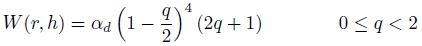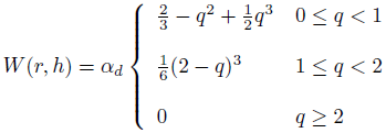 , onde r é a distância entre as partículas i e j. Neste trabalho são utilizadas as seguintes funções de suavização, Spline Cúbica: