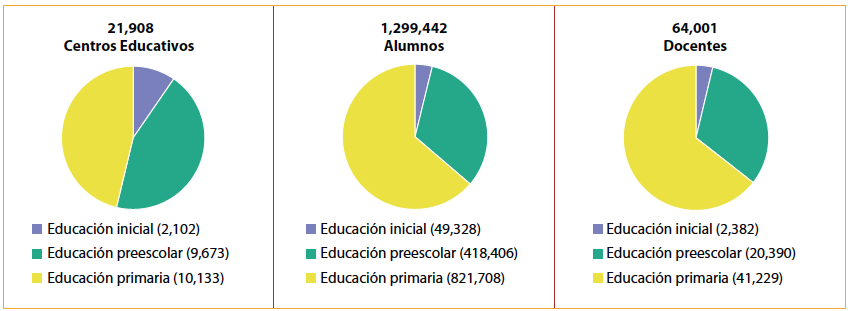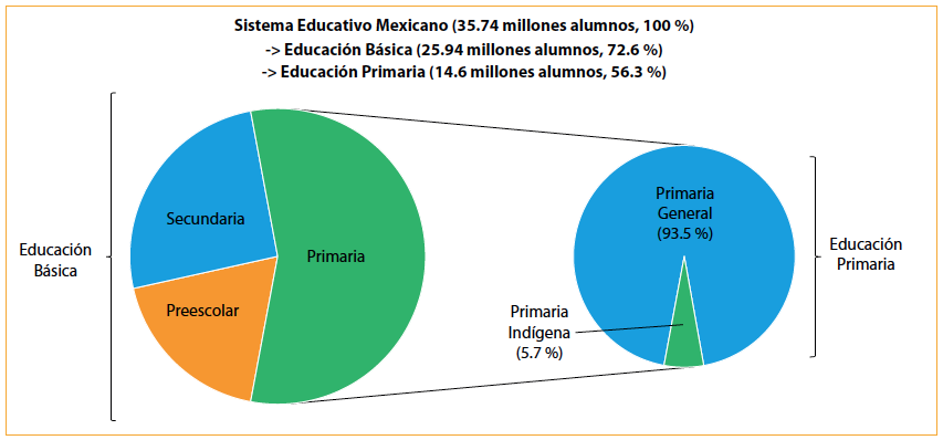 En el ciclo escolar 2013-2014 se matricularon un total de 35.74 millones de alumnos en el sistema educativo nacional. Entre ellos, había 14.6 millones de alumnos inscritos en la educación primaria, de los cuales 13.6 millones (o un 93.5% de alumnos de primarias) pertenecían al sistema educativo general; éstos fueron atendidos por 524 450 maestros en 637 872 grupos y en 77 821 escuelas primarias. Los otros 834 572 alumnos de primarias (que corresponden a un 5.7%) pertenecían a la educación primaria indígena o bilingüe y bicultural y fueron atendidos por 36 246 maestros en 65 268 grupos, en 10 102 escuelas indígenas y en 24 de 32 entidades federativas. (SEP, 2014, pp. 15, 16, 61, 76, 77).
