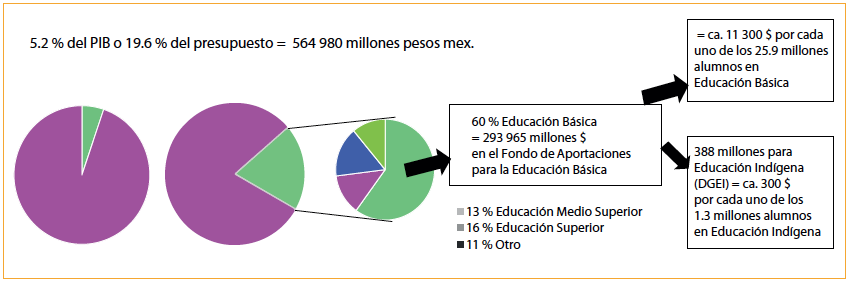 Estas cifras demuestran que el gobierno mexicano invirtió en el año 2012 casi 38 veces más en la educación básica que en la educación indígena. (OCDE, 2015, p. 3, Mejía Botero, 2012, p. 22, Serdán Rosales, 2011, pp. 14, 16, 19, INEE, 2012, p. 2, Narro Robles y Moctezuma Navarro, 2012, p. 172).