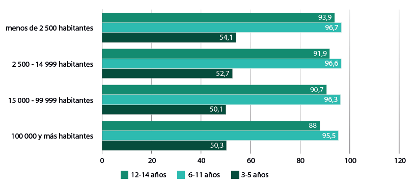Conforme crece el tamaño de la localidad, aumenta la cobertura del sistema educativo. La diferencia porcentual más elevada entre las localidades con más y menos habitantes corresponde a los jóvenes mexicanos entre 12 y 14 años, con casi 6%.