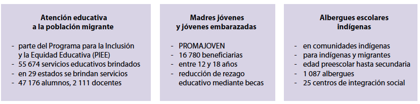 Además, existen varios tipos de servicios por parte de la Subsecretaría de Educación Básica de la SEP, que responde a requerimientos específicos de los pueblos originarios, así como de grupos migratorios y de la población rural dispersa, para así cumplir con los deberes legales señalados en el artículo 38 de la Ley General de Educación. El Consejo Nacional de Fomento Educativo (CONAFE) ofrece cursos comunitarios para la población indígena, rural y migrante, de igual manera mantiene escuelas para migrantes y telesecundarias para garantizar la participación educativa de la población en comunidades rurales de alta marginación por medios electrónicos y de comunicación, tales como la televisión, señal satelital y videos (INEE, 2016, p. 27).