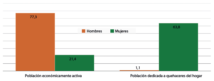 Asimismo, los indígenas entran más pronto al mercado laboral a comparación de los demás. El 48.8% de la población hablante de una lengua indígena de 12 años o más, ya es económicamente activa a comparación del 91.8% de los no indígenas entre 12 y 14 años, quienes todavía asisten a la escuela. La gráfica demuestra el porcentaje de la población de 12 años o más, hablante de una lengua indígena que es económicamente activa y que realiza quehaceres domésticos (INEGI, 2013, pp. 95, 96, 99, 100, 145, 154).