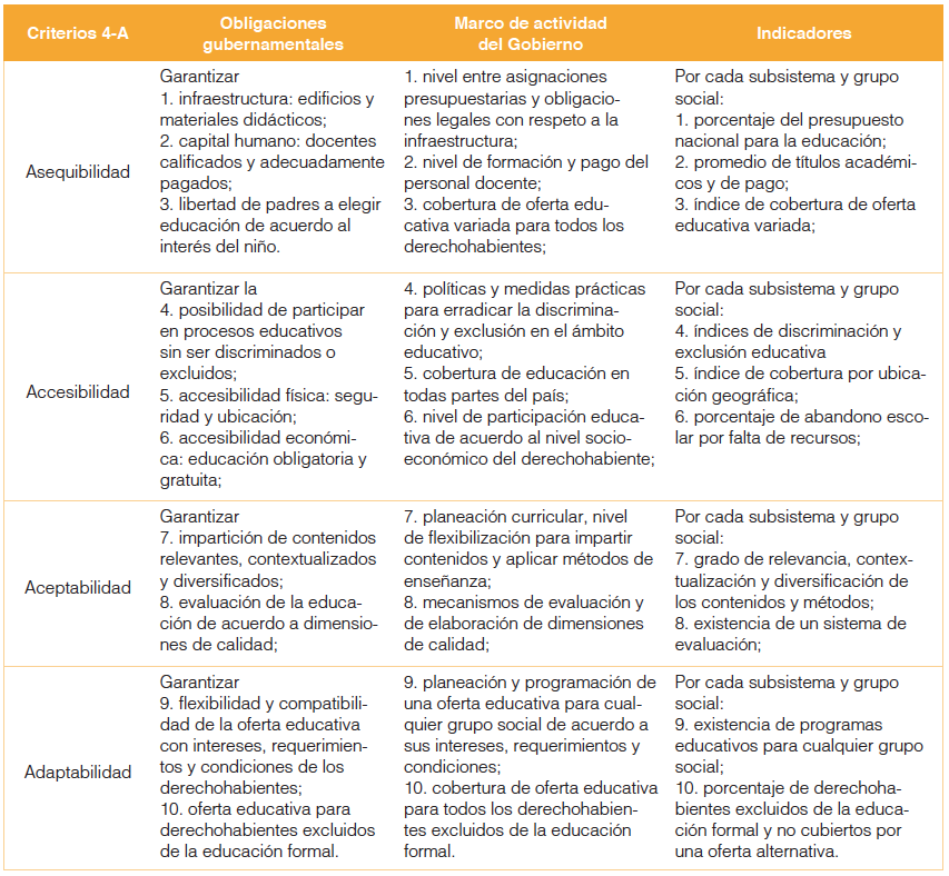 El marco teórico de este trabajo se apoya en cuatro distinciones analíticas desarrolladas por Tomasevski y que son los criterios 4-A de una educación con calidad y equidad: estos son asequibilidad, accesibilidad, aceptabilidad y adaptabilidad (1999, Comentario General núm. 13), y a continuación se explican.