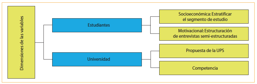 La investigación se sustentó en el uso de dos técnicas de recopilación de datos, tres grupos focales y 15 entrevistas semi-estructuradas. Las variables utilizadas en el estudio se establecen en dos dimensiones, una de ellas corresponde a los estudiantes y la otra a la universidad, la primera deriva dos enfoques, uno socioeconómico que define la estratificación de los segmentos a investigar y posteriormente con la definición del discurso a trasmitir; el segundo enfoque es el motivacional a partir del cual se estructuraron las entrevistas. De acuerdo a la segunda dimensión, se considera tanto la propuesta actual de la UPS como la competencia que a nivel nacional la conforman la Escuela Politécnica Nacional, Escuela Superior Politécnica del Litoral, Escuela Politécnica del Ejército, Escuela Superior Politécnica del Chimborazo, Pontificia Universidad Católica de Quito, Universidad Central del Ecuador, Universidad de Cuenca, Universidad del Azuay, Universidad San Francisco de Quito, Universidad Técnica de Ambato y la Universidad Técnica Particular de Loja entre tanto, en el ámbito local está dada por la Universidad de Cuenca, Universidad del Azuay y Universidad Católica de Cuenca.